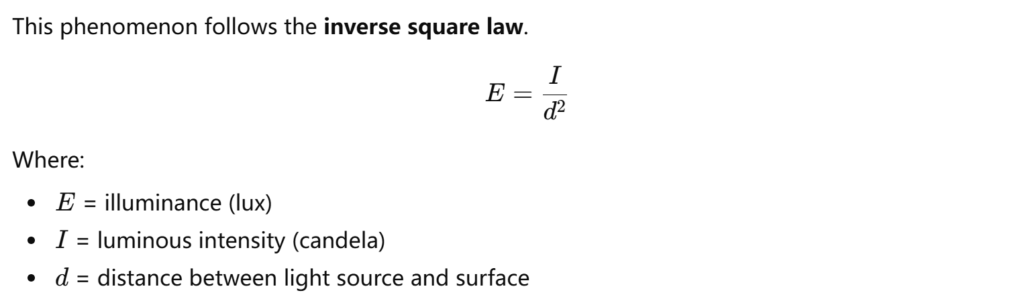 Lighting intensity decreases as the distance between the light source and the illuminated surface increases.