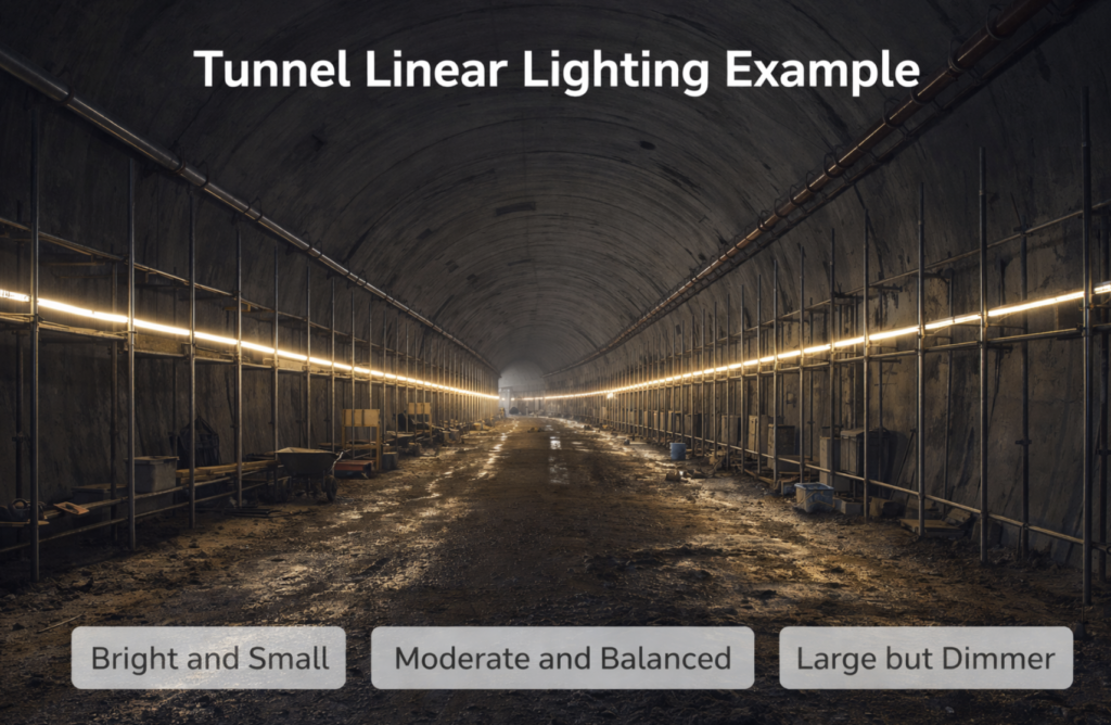 For tunnels, scaffolding, and other long structures, continuous lighting systems such as LED strip lighting often provide more uniform visibility than isolated light sources.