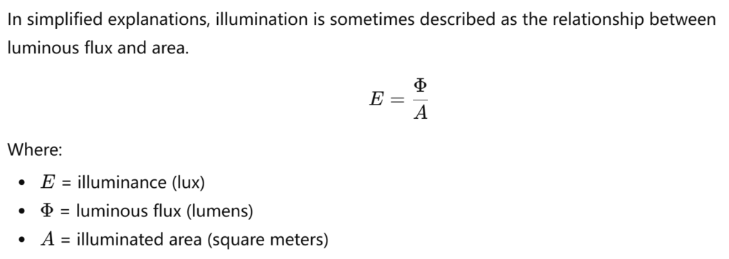 In simplified explanations, illumination is sometimes described as the relationship between luminous flux and area.